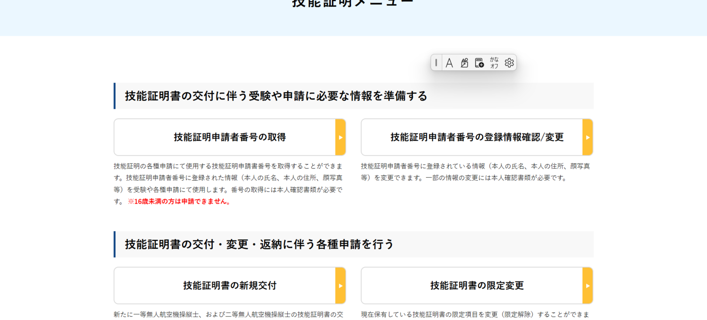 そのあと、「技能証明」→「申請者情報の変更」へ